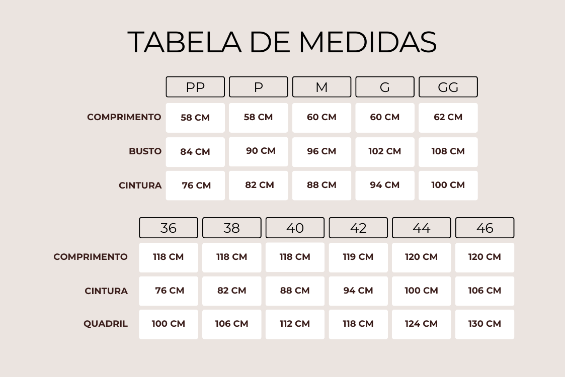 Tamanhos: 36, 38, 40, 42 e 44